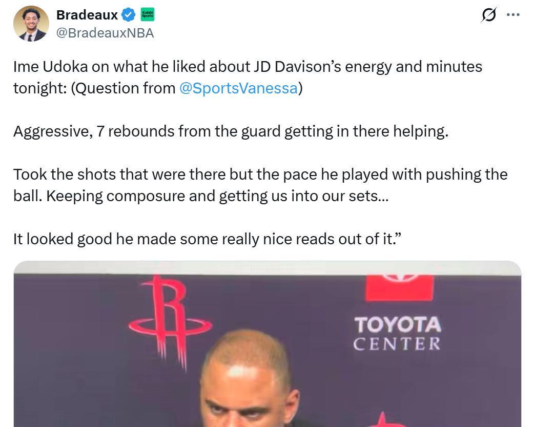 反观JD戴维森在进攻端扎扎实实有条不紊,能够安安稳稳将球交给申京或者杜兰特处理,同时防守端积极性拉满,不仅不会被针对,还能频频送上高质量协防,这让乌度卡在决胜时刻也将其留在场上,最终帮助球队顺利拿下胜利。