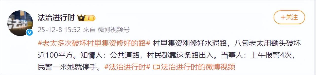 《#老太多次破坏村里集资修好的路# 》——法治进行时 25-12-8 15:52 来自 微博视频号