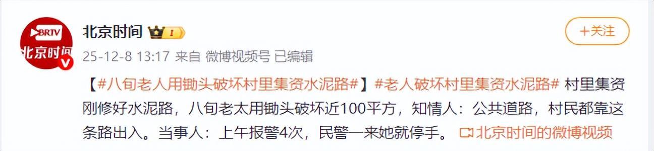 《【#八旬老人用锄头破坏村里集资水泥路#】》——北京时间 25-12-8 13:1 来自 微博视频 已编辑