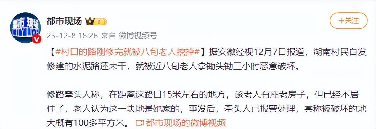 《【#村口的路刚修完就被八旬老人挖掉#】》——都市现场 25-12-8 18:26 来自 微博视频号